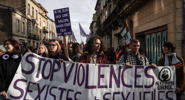 Demonstrators hold placards reading “For a feminist education in school” during a protest to condemn violence against women, called by feminist organisations two days prior to the international day for the elimination of violence against women, in Paris, on November 23, 2024. (Photo by STEPHANE DE SAKUTIN / AFP)